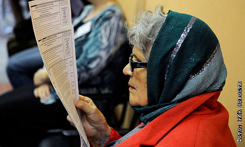 Женщина читает избирательный бюллетень во время выборов депутатов городского совета Красноярска.