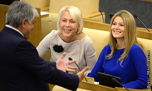Заместитель председателя комитета ГД РФ по аграрным вопросам Надежда Школкина и член комитета ГД по культуре, актриса Мария Кожевникова (справа) во время пленарного заседания Государственной Думы Российской Федерации.