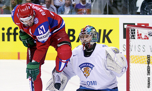 Игрок сборной России Александр Радулов и вратарь сборной Финляндии Теему Лассила (слева направо) в матче чемпионата мира по хоккею: Россия - Финляндия.