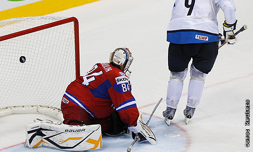 Игрок сборной Финляндии и вратарь сборной России в матче чемпионата мира по хоккею: Россия - Финляндия.