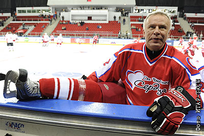 Руководитель Федерального агентства по физической культуре и спорту Вячеслав Фетисов во время благотворительного товарищеского матча "От чистого сердца" между командами Ильи Ковальчука и Александра Овечкина, который состоялся в ДС "Сокольники". Игра завершилась вничью - 13:13