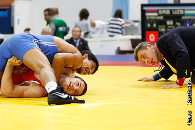 Узбекистанский борец Дильшод Арипов (в синей форме) и Давор Стефанек (в красной) из Сербии в поединке весовой категории до 60 кг