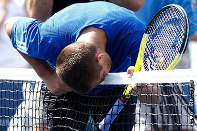 Российский теннисист Михаил Южный целует сетку после победы над испанцем Томми Робредо во время турнира US Open в США
