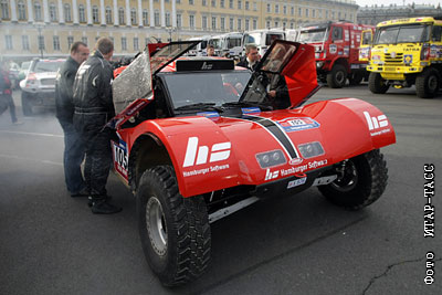 Участники команды Hamburger Software из Германии перед стартом международного ралли "Шелковый путь-2010" серии Дакар (Dakar series) на Дворцовой площади Санкт-Петербурга