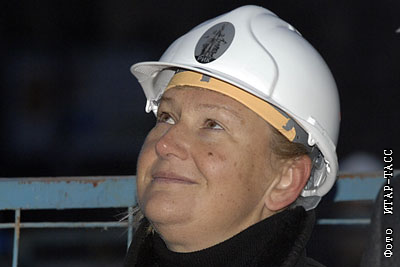Супруга мэра Москвы, глава компании "Интеко" Елена Батурина на ВВЦ во время установки на постамент скульптурной группы Веры Мухиной "Рабочий и колхозница". Ноябрь 2009