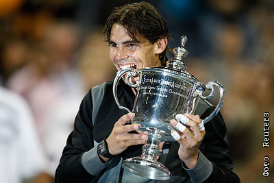 Испанский теннисист Рафаэль Надаль впервые победил на U.S. Open. На церемонии награждения пробует кубок на зуб