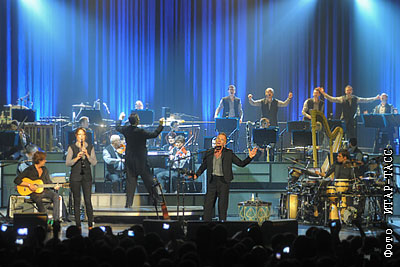 Британский певец Стинг (в центре) во время выступления в сопровождении Королевского Филармонического оркестра из Лондона в "Крокус Сити Холл"