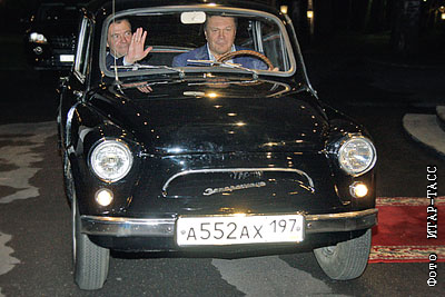 Президент России Дмитрий Медведев и президент Украины Виктор Янукович (слева направо) в салоне автомобиля "Запорожец", на котором они прокатились по территории резиденции "Завидово"