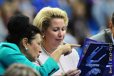Главный тренер сборной команды России по художественной гимнастике Ирина Винер и супруга президента РФ Светлана Медведева (слева направо) на чемпионате мира по художественной гимнастике в СК "Олимпийский" в Москве