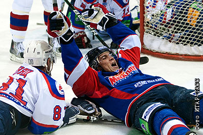 Игрок "Металлурга" Максим Мамин (справа) после забитого гола в матче чемпионата КХЛ: "Металлург" (Магнитогорск) - "Сибирь" (Новосибирск) - 1:3