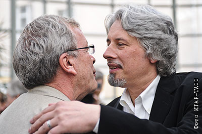 Писатель Виктор Ерофеев и лауреат российско-итальянской литературной "Премии Горького" писатель Владимир Сорокин перед началом церемонии награждения в Государственном музее им. А. С. Пушкина.