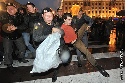 Задержание лидера движения "Мы" Романа Доброхотова во время акции против Юрия Лужкова на Тверской площади