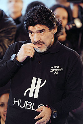 Бывший тренер аргентинской сборной по футболу Диего Марадона во время благотворительной акции, которая прошла на крыше ЦУМа. Марадона совершил удары мячом по мишеням, скрывающим суммы от 25 до 300 тысяч долларов, которые будут направлены на помощь российским детям, страдающим раком