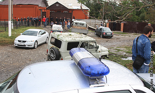 Люди на месте взрыва у районного отделения внутренних дел в селении Серноводск Сунженского района Чеченской республики. Утром 16 сентября, в результате атаки смертника пытавшегося прорваться на территорию РОВД, погибли трое полицейских и еще четверо получили ранения.