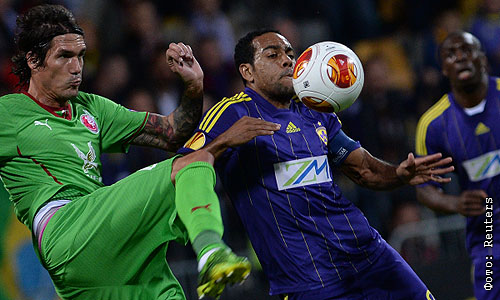 Игрок "Рубина" Сесар Навас (слева) и игрок "Марибора" Маркос Таварес в матче группового этапа Лиги Европы УЕФА между ФК "Марибор" (Марибор) и ФК "Рубин" (Казань).