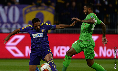 Игрок "Марибора" Маркос Таварес (слева) и игрок "Рубина" Янн М'Вила в матче группового этапа Лиги Европы УЕФА между ФК "Марибор" (Марибор) и ФК "Рубин" (Казань).