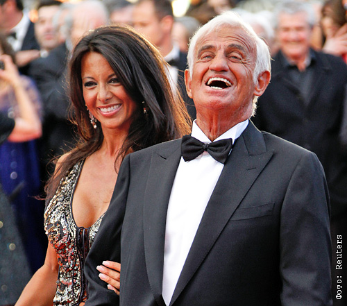 Актер Жан-Поль Бельмондо и бывшая модель журнала "Playboy" Барбара Гэндолфи перед показом документального фильма о карьере Бельмондо на 64-ом Каннском кинофестивале