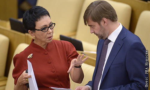 Заместитель председателя комитета Государственной Думы РФ по регламенту и организации работы Государственной Думы РФ Лариса Шойгу и заместитель председателя Государственной Думы РФ Сергей Железняк на пленарном заседании Государственной Думы РФ.