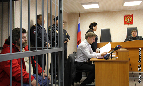 Активист Greenpeace Роман Долгов (слева), обвиняемый в терроризме и ведении незаконной научно-исследовательской деятельности, перед началом избрания меры пресечения в Ленинском суде города Мурманска. По решению суда Долгов и фотограф Денис Синяков арестованы до 24 ноября 2013 года.