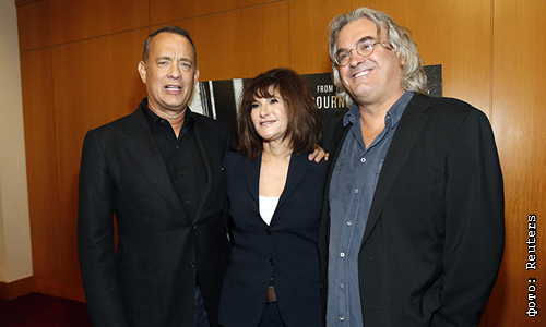 Актер Том Хэнкс, режиссер Пол Гринграсс и Эми Паскаль на премьере фильма "Капитан Филлипс" в Академии кинематографических искусств и наук.