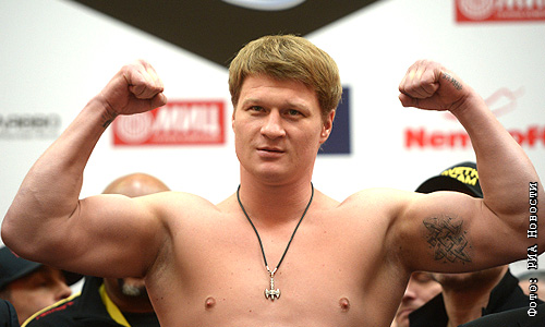 Российский боксер Александр Поветкин на церемонии взвешивания перед боем с украинским боксером Владимиром Кличко, который состоится 5 октября 2013 года в Москве.