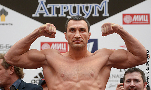 Украинский боксер Владимир Кличко на церемонии взвешивания перед боем с российским боксером Александром Поветкиным, который состоится 5 октября 2013 года в Москве.