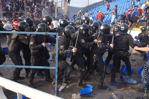 Сотрудники ОМОНа на месте беспорядков, устроенных болельщиками на стадионе "Металлург" во время матча чемпионата России по футболу между самарскими "Крыльями советов" и московским "Спартаком"
