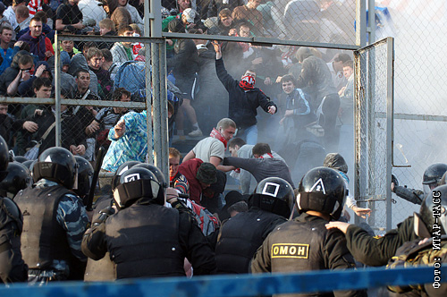 Сотрудники ОМОНа на месте беспорядков, устроенных болельщиками во время матча чемпионата России по футболу между самарскими "Крыльями советов" и московским "Спартаком"