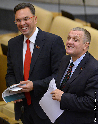 Заместитель председателя комитета Государственной Думы РФ по труду, социальной политике и делам ветеранов, депутат фракции КПРФ Николай Коломейцев (справа) и член комитета ГД по обороне, депутат фракции КПРФ Владимир Бессонов на пленарном заседании нижней палаты российского парламента.