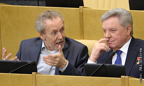 Член комитета Государственной Думы РФ по труду, социальной политике и делам ветеранов, депутат фракции "Единая Россия" Валерий Трапезников (слева) и член комитета ГД по международным делам, депутат фракции "Единая Россия" Борис Громов на пленарном заседании нижней палаты российского парламента.