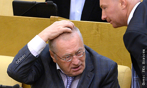Член комитета Государственной Думы РФ по обороне, руководитель фракции ЛДПР Владимир Жириновский (слева) и заместитель председателя Госдумы РФ, депутат фракции ЛДПР Игорь Лебедев на пленарном заседании нижней палаты российского парламента.