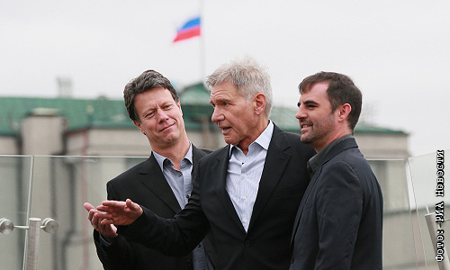 Режиссер Гевин Худ, актер Харрисон Форд и сценарист Роберто Орси (слева направо) во время фотоколла в отеле "Ритц-Карлтон" в Москве.