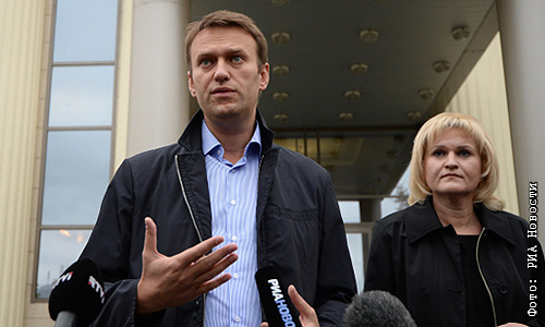 Оппозиционер Алексей Навальный и адвокат Ольга Михайлова у здания Мосгорсуда после судебного заседания.