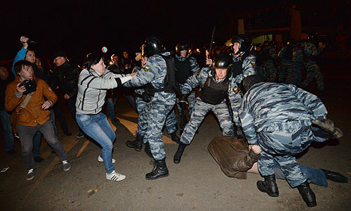 Сотрудники полиции задерживают участников беспорядков во время народного схода в московском районе Бирюлево. Местные жители собрались у торгового комплекса "Бирюза" в районе Бирюлево Западное в Москве, требуя найти убийц Егора Щербакова.