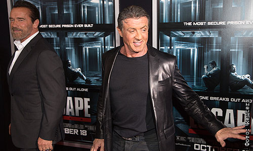 Арнольд Шварценеггер и Сильвестр Сталлоне на премьере фильма "План побега" в Нью-Йорке.