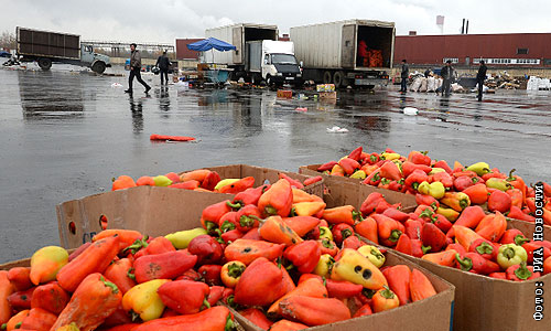 Торговцы забирают остатки товара с территории закрывшегося рынка при овощебазе "Новые Черемушки" в столичном районе Бирюлево.