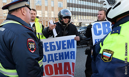 Участники акции в поддержку байкера Юрия Некрасова, обвиняющегося в убийстве, на Зубовском бульваре в Москве.