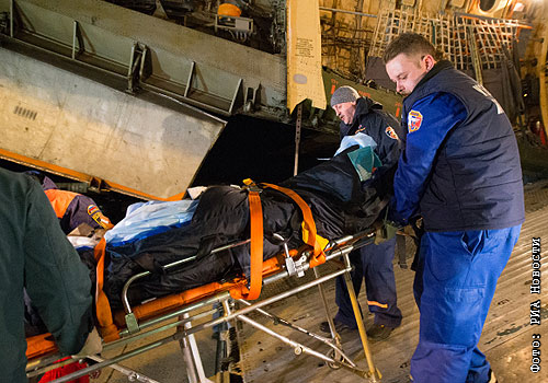 Сотрудники МЧС помогают перевезти пострадавших в результате теракта в Волгограде из самолета в санитарные машины.