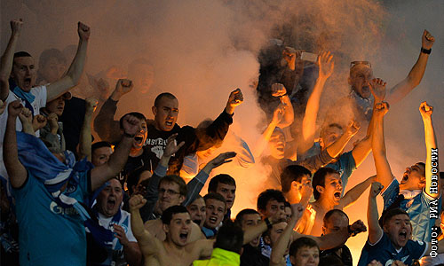 Болельщики "Зенита" радуются забитому голу в матче группового этапа Лиги Чемпионов УЕФА сезона 2013/14 между ФК "Порту (Португалия, Порту) и ФК "Зенит" (Россия, Санкт-Петербург).
