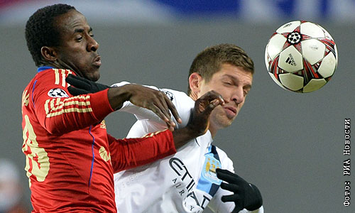Игрок ЦСКА Сейду Думбия и игрок ФК "Манчестер Сити" Матия Настасич (слева направо) в матче группового этапа Лиги Чемпионов УЕФА сезона 2013/14 между ПФК ЦСКА (Россия, Москва) и ФК "Манчестер Сити" (Великобритания, Манчестер).