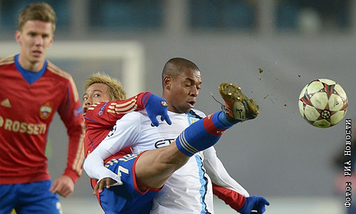 Игрок ПФК ЦСКА Кейсуке Хонда (слева) и игрок ФК "Манчестер Сити" Фернандиньо Роза в матче группового этапа Лиги Чемпионов УЕФА сезона 2013/14 между ПФК ЦСКА (Россия, Москва) и ФК "Манчестер Сити" (Великобритания, Манчестер).