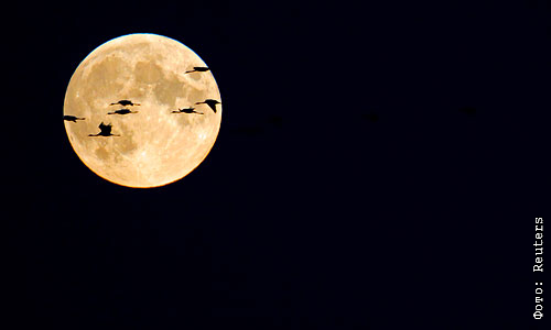 Стая журавлей, летящих на зимовку, на фоне луны.