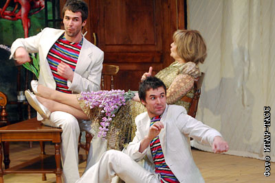 Актеры Ольга Яковлева в роли Джудит Блисс, Артем и Владимир Панчик в роли братьев Тайрелл в спектакле режиссера Александра Марина на Малой сцене МХТ им. А.П. Чехова.