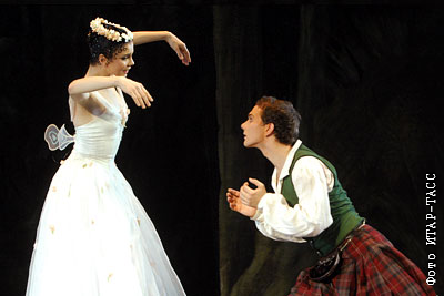 Наталья Осипова исполняет партию Сильфиды и Вячеслав Лопатин в партии Джеймса на репетиции балета в постановке Йохана Кобборга на сцене Большого театра.