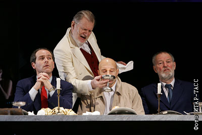 Актеры Михаил Шац в роли премьер-министра Великобритании, Юозас Будрайтис в роли Отца, Денис Яковлев в роли президента России и Регимантас Адомайтис в роли президента США (слева направо) в спектакле режиссеров Олега и Владимира Пресняковых «Паб»