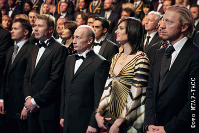 Российский гимнаст Алексей Немов, финский гонщик Мика Хаккинен, президент России Владимир Путин, российская легкоатлетка Елена Исинбаева и немецкий теннисист Борис Беккер (слева направо) на IX ежегодной церемонии вручения премии Мировой академии в концертном зале Государственного академического Мариинского театра