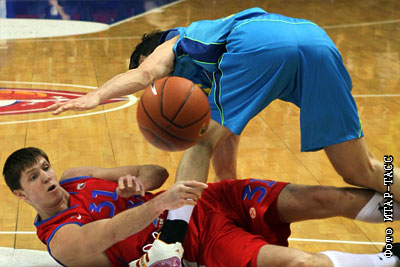 Армеец Виктор Хряпа (слева) в матче Евролиги УЛЕБ по баскетболу: ЦСКА (Россия) – «Барселона» (Испания)