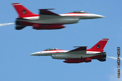Истребители F-16 Fighting Falcon, разработанный компанией General Dynamics (США), представлен на международном авиасалоне Singapore Airshow 2008 в выставочном центре Чанджи