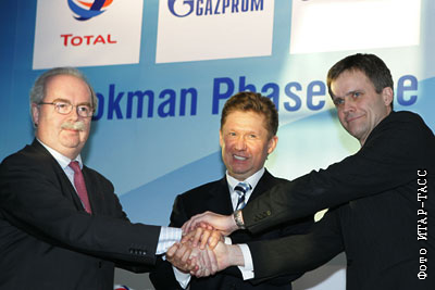 Президент и генеральный директор Total SA Кристоф де Маржери, председатель правления ОАО "Газпром" Алексей Миллер и президент и главный управляющий StatoilHydro Хелге Лунд (слева направо) на церемонии подписания документов о создании совместной компании специального назначения для разработки первой фазы Штокмановского газоконденсатного месторождения