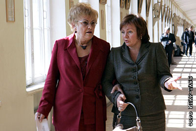 Людмила Вербицкая и супруга президента России Людмила Путина (слева направо) в здании СПбГУ. Людмила Путина прибыла в Санкт-Петербург на церемонию закрытия фестиваля "Русское слово"
